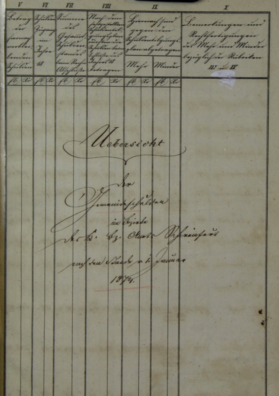 Das Papier wenig gebräunt und fleckig. - Die handschriftliche tabellarische Aufstellung zeigt den Stand und die Entwicklung der Gemeindeschulden 1872 und 1873 im Bezirk Schweinfurt in alphabetischer Reihenfolge und zieht zum Ende eine Schuldensumme. Die Tabelle zeigt ebenso einen Schuldentilgungsplan (Zielbetrag) und die Abweichungen jeder Gemeinde davon mit entsprechenden Rechtfertigungen und Bemerkungen.