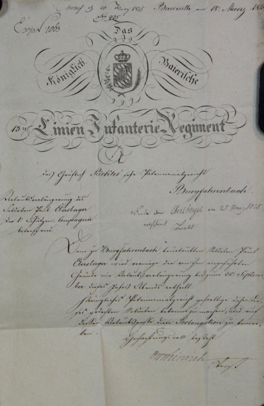Deutsche Handschrift auf einem Doppelblatt aus Papier mit gedrucktem Briefkopf des "Königlich Baierischen 13te Linien Infanterie Regiments", dat. Bayreuth den 18. März 1825. Fol (33,8 x 22 cm). - Mehrfach gefaltet, leicht knittrig, der rechte Rand etwas gebräunt; mit Siegelresten. - Der Oberst Joseph Heinrich teilt dem Pücklerschen Patrimonialgericht in Burgfahrenbach (Burgfarrnbach) mit, dass der von dem zu Burgfahrenbach beurlaubten Paul Ebersberger beantragten Urlaubsprolongation zugestimmt wird, und zwar bis zum 30. September abends des gleichen Jahres.