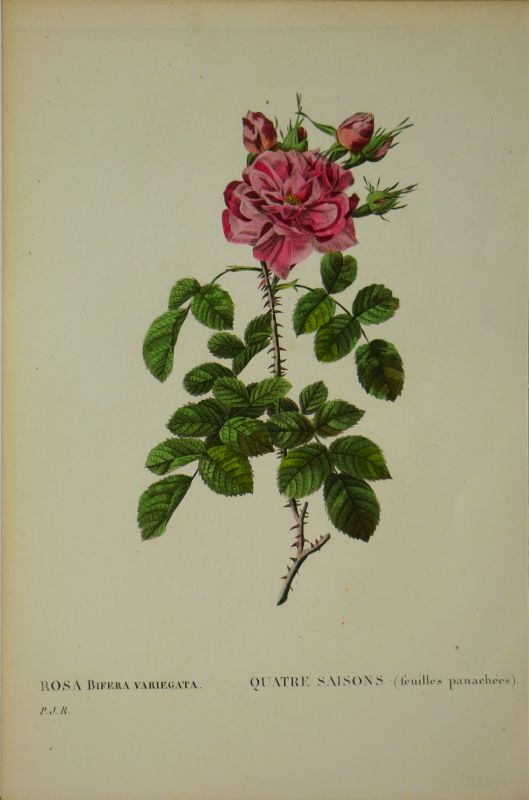 Darstellung der Rose mit einer großen, rosa Blüte sowie Knospen und Blattwerk. Farbig gedruckter Kupferstich von Pierre Joseph Redouté, um 1820. 23,4 x 15,4 cm (ganzes Blatt). - Minimal gebräunt, die Papierkanten leicht stärker, rechte Seite knapp an den Plattenrand beschnitten. - Dekorativ und selten!