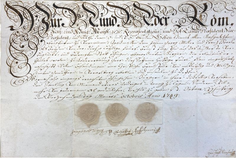 Hs. Empfehlung auf einem gefalteten Blatt, Kanzlei-Handschrift auf Papier mit drei Trockensiegeln, dat. 14. Oktober 1749. 30,2 x 44,8 cm. - Schwach gebräunt, an den Faltstellen gering stärker. - Unleserlich signiertes Schreiben, das den beiden Bürgern Johann Georg Müller und Franz Hörnle die Erlaubnis erteilt, in Vorarlberg eine Brandsteuer erbitten und einsammeln zu dürfen. Anlass ist der verheerende Brand, der im Jahre 1749 die Stadt Ehingen verwüstet hat. Die Empfehlung fordert ferner dazu auf, die beiden Abgeordneten aktiv in ihrem Vorhaben zu unterstützen.